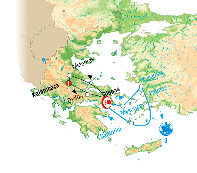 Atenas, Kamena Vourla, Kalambaka, Delfos, miconos, Kusadasi, Patmos, Heraclion, Santorini.