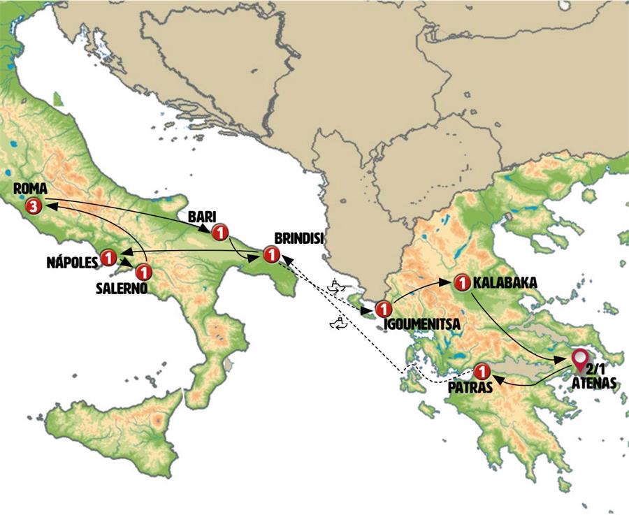 Atenas, Tripoli, Olympia, Patras, Igumenitsa, ferri igumenitsa brindisi, Brindisi, Alberobello, Matera, Nápoles, Capri, Sorrento, Salerno, Pompeia, Cassino, Roma, abadia san giovanni in venere, Termoli, Bari, ferri brindisi igumenitsa, Metsovo, Kalambaka, Delfos, Hosios Loukas.
