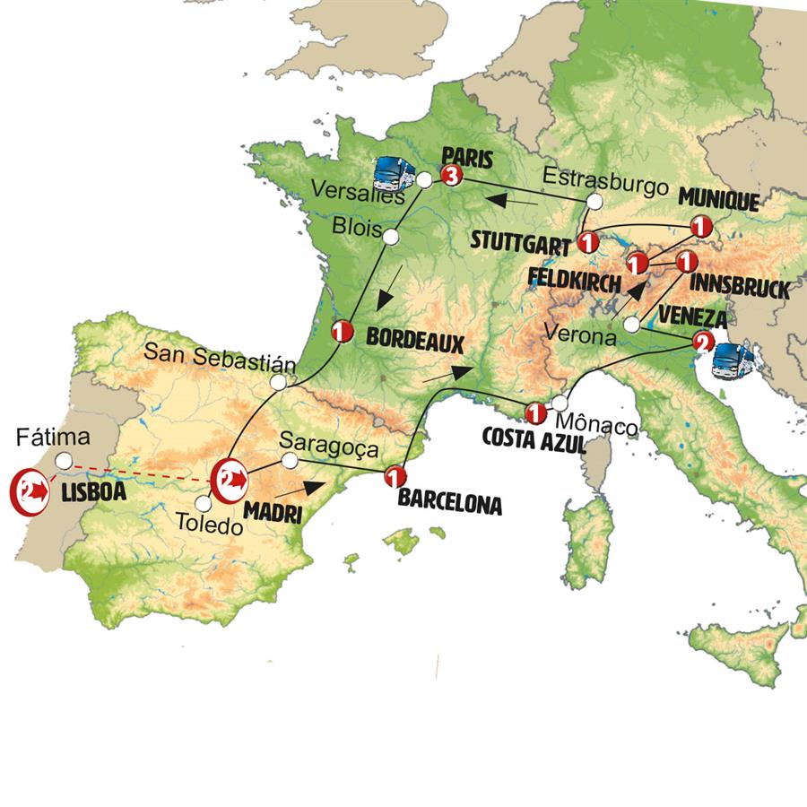 Madrid, Zaragoza, Barcelona, Cote D´azur, Cidade de Mônaco, Gênova, Veneza, Verona, Lago de Garda, Innsbruck, zugspitze, Feldkirch, Lago Constança , Lindau, Munique, Stuttgart, Heidelberg, Strasbourg, Paris, Blois, Tours, Bordeaux, San Sebastian, Area de Serviço Foronda.