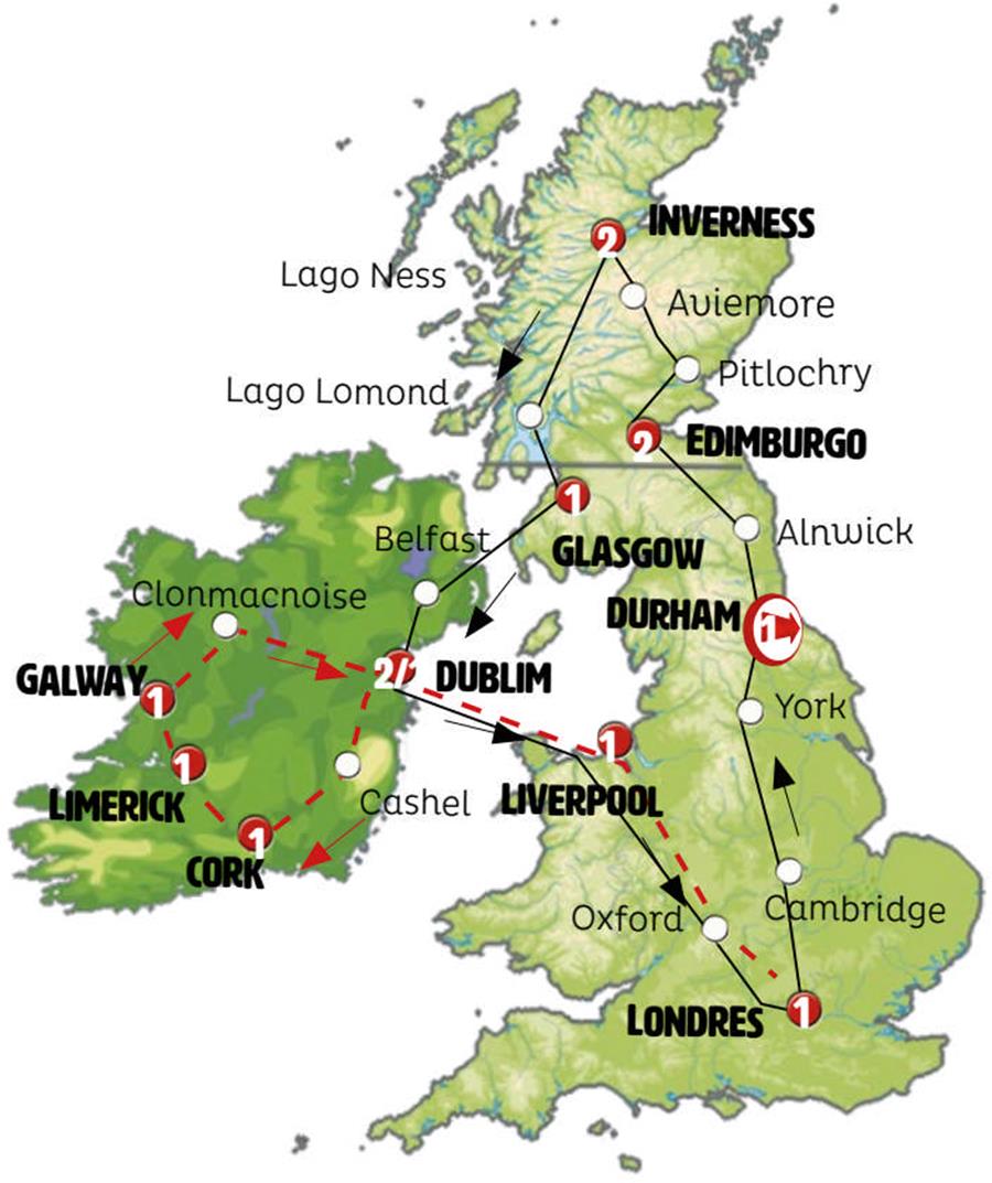 Londres, Cambridge, York, Durham, Alnwick, Edimburgo, los kelpies, Stirling, Pitlochry, culloden, Inverness, Fort William, Inveraray, Lago Lomond, Glasgow, belfast, Dublin, Caernarfon, Liverpool, stratford, Oxford.