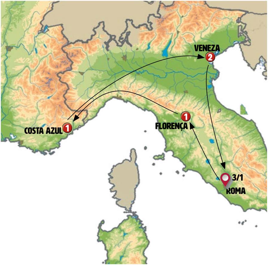 Roma, Florença, Pisa, SESTRI LEVANTE, Montecarlo, Cote D´azur, Cidade de Mônaco, Gênova, Veneza, Ravena, Assis.
