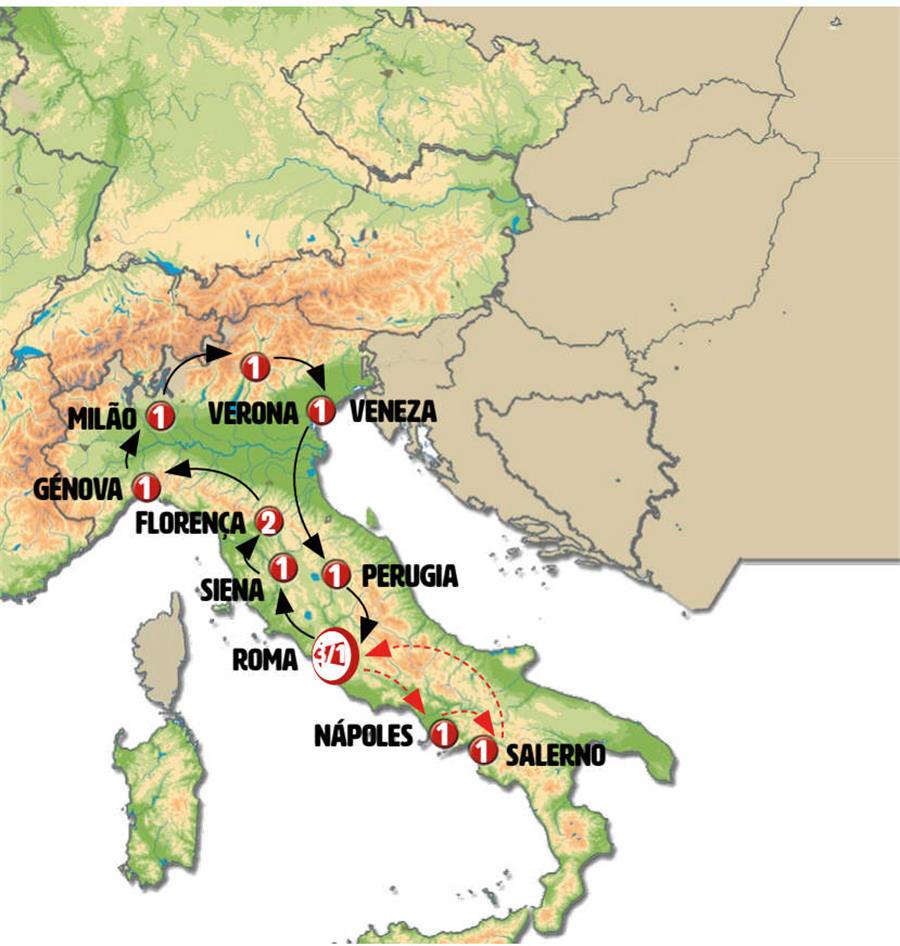 Roma, Orvieto, Castiglione Del Lago, Siena, Monteriggioni, San Gimignano, Florença, Pisa, Cinque Terre, Gênova, Portofino, Milão, Região dos Lagos, Verona, Veneza, Pádua, San Marino, Gubbio, Perugia, Assis, Nápoles, Capri, Sorrento, Salerno, Pompeia, Cassino.