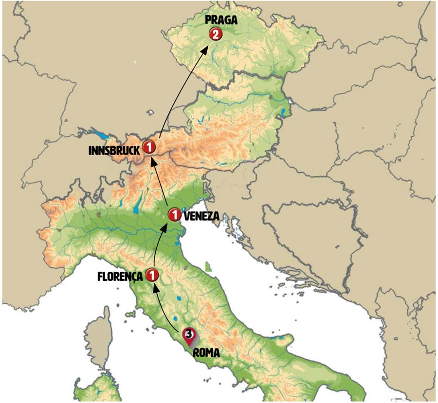 Roma, Florença, Veneza, Verona, Lago de Garda, Innsbruck, Munique, Ratisbona, Praga.