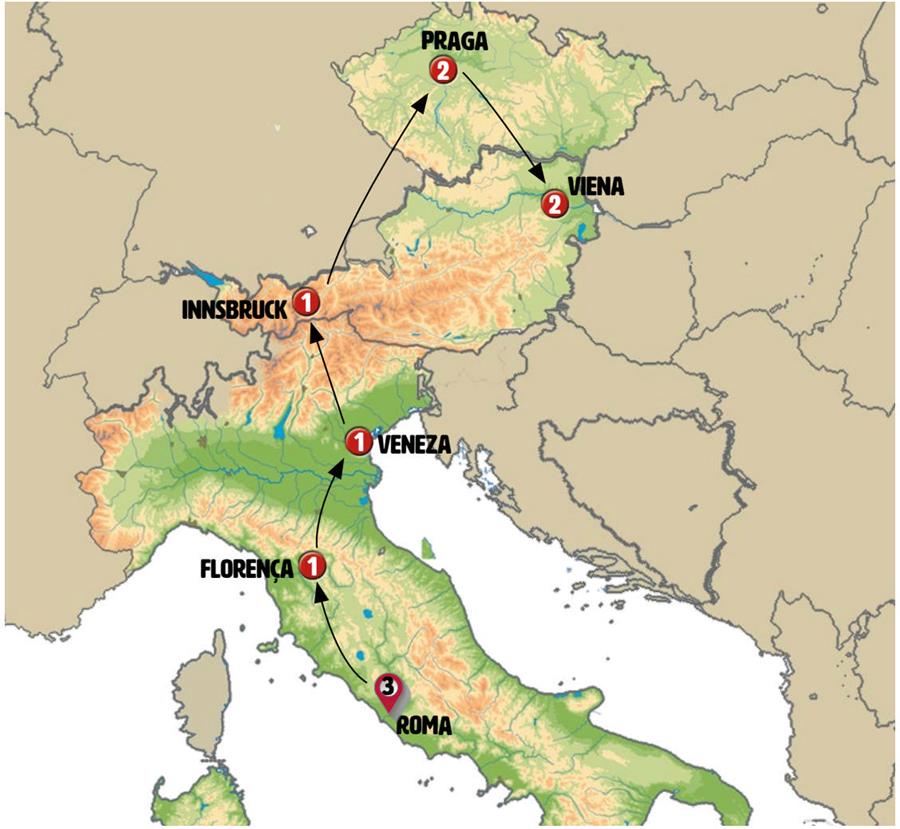 Roma, Florença, Veneza, Verona, Lago de Garda, Innsbruck, Munique, Ratisbona, Praga, Ceske Budejovice, Cesky Krumlov, Viena.