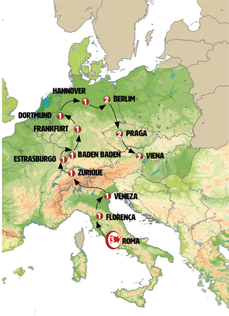 Roma, Florença, Veneza, Lugano, Lucerna, Zurich, basilea, Colmar, Riquewihr, Strasbourg, friburgo de brisgovia, Triberg, Gengenbach, baden baden, espira, Heidelberg, Frankfurt, crucero por el rhin, Colônia, Dortmund, ruta cuentos de hadas, Hannover, Goslar, Berlim, Dresden, Praga, Ceske Budejovice, Cesky Krumlov, Viena.
