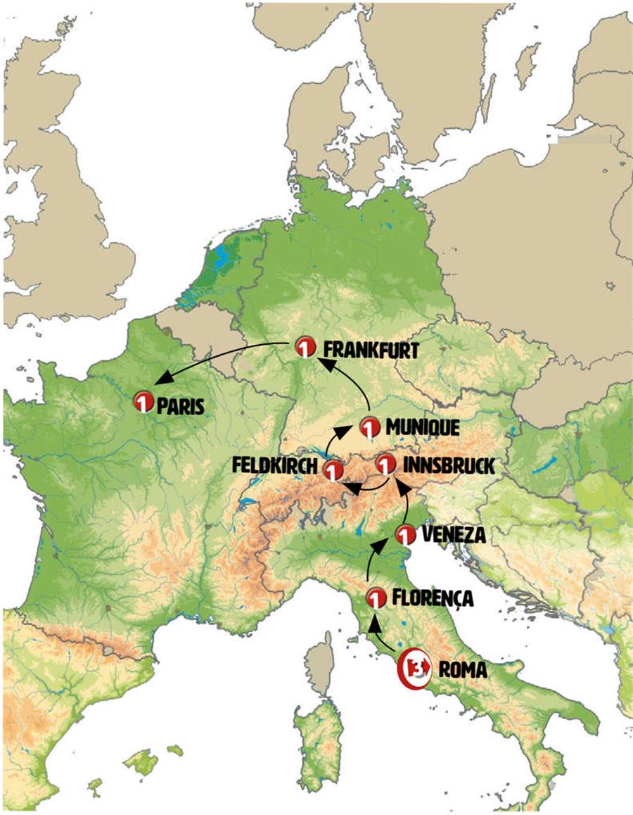 Roma, Florença, Veneza, Verona, Lago de Garda, Innsbruck, zugspitze, Feldkirch, Lago Constança , Lindau, Munique, Füssen, Rotemburgo, Frankfurt, Luxemburgo, Reims, Paris.