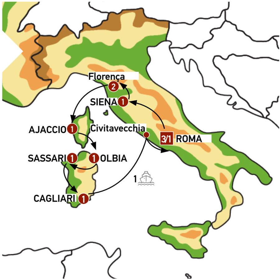Roma, Orvieto, Castiglione Del Lago, Siena, Monteriggioni, San Gimignano, Florença, Livorno, Bastia, Corte, Ajaccio, Bonifacio, Palau, La Maddalena, Sassari, ALGHERO, Bosa, Cagliari, nuraghe losa, Olbia, ferri cagliari civitavecchia.