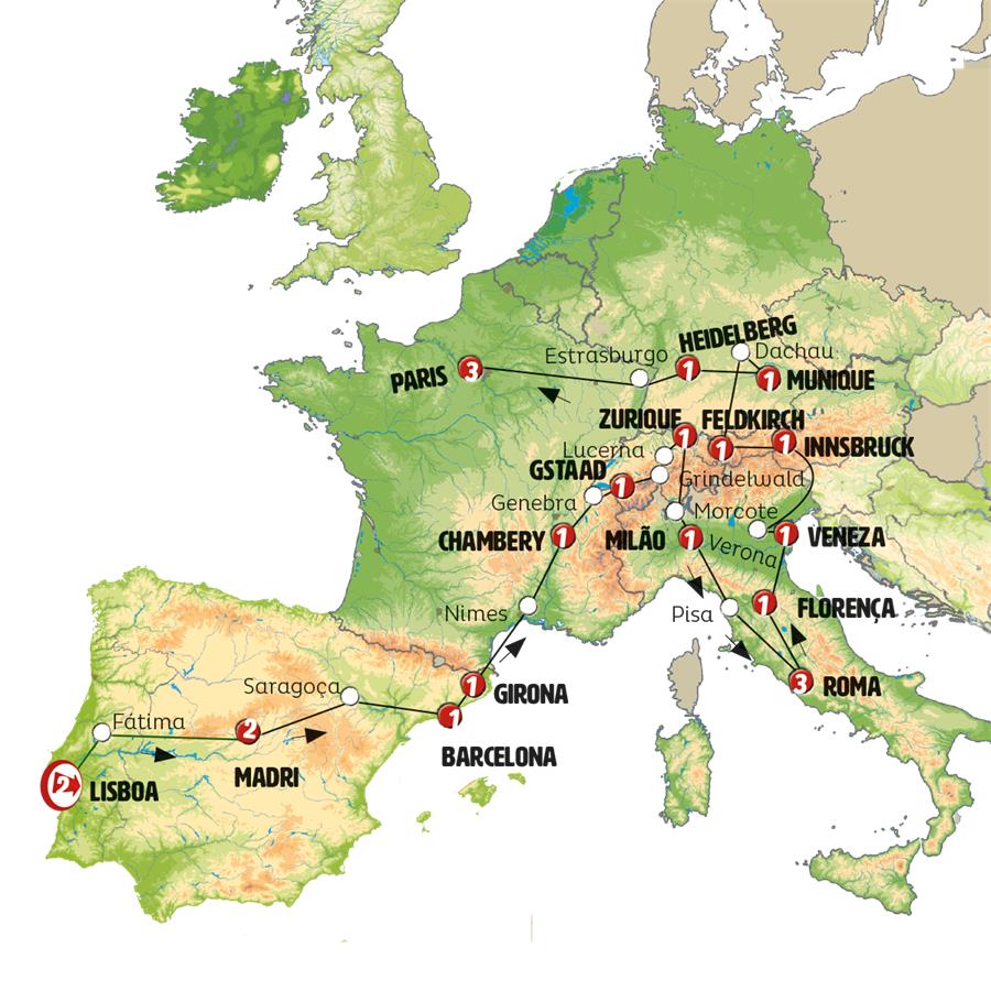 Lisboa, Cáceres, Madrid, Zaragoza, Poblet, Barcelona, Gerona, carrieres de lumiere, Chambery, Genebra, Gruyeres, Leysin, Interlaken, Lucerna, Zurich, Bellinzona, Como, Milão, Gênova, Pisa, Florença, Roma, Bolonha, Ferrara, Veneza, Verona, Lago de Garda, Innsbruck, zugspitze, Feldkirch, Lago Constança , Lindau, Munique, Stuttgart, Heidelberg, Strasbourg, Paris.