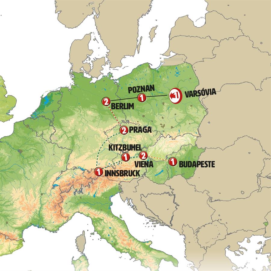 Varsóvia, Poznan, Berlim, Dresden, Praga, Munique, Innsbruck, Salzburgo, Lago Traunsee, Viena.