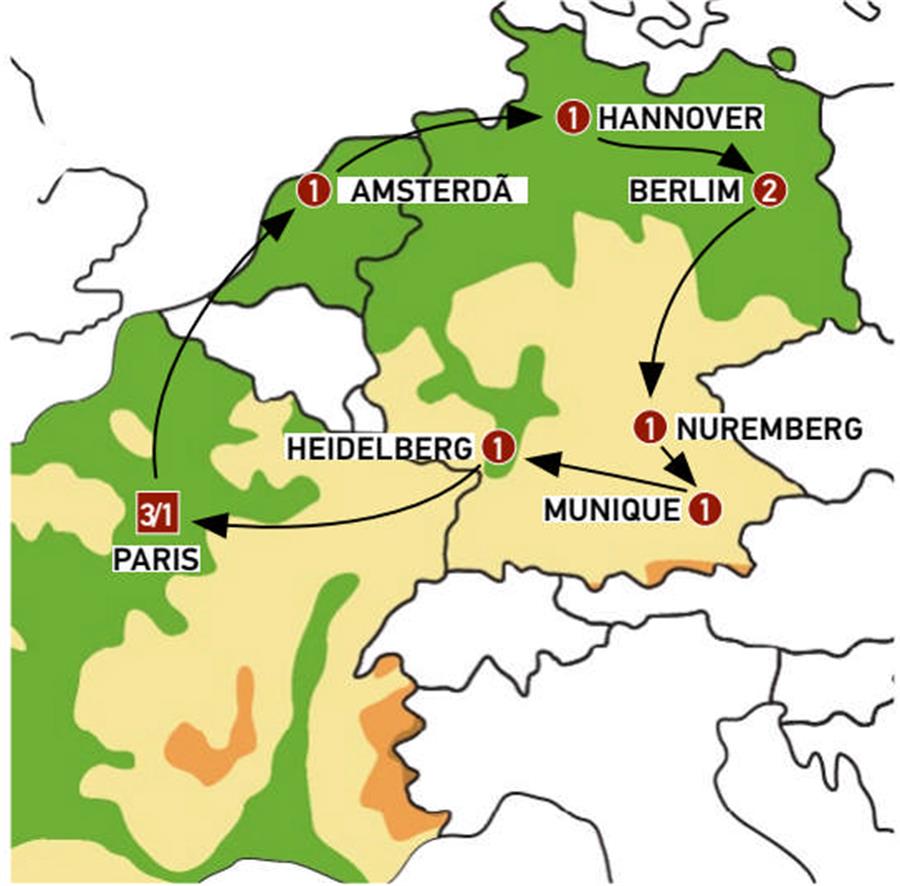 Paris, Bruges, Amsterdã, Hannover, Goslar, Berlim, Dresden, Bamberg, Nuremberg, kloster weltenburg, Dachau, Munique, Stuttgart, Heidelberg, Strasbourg.