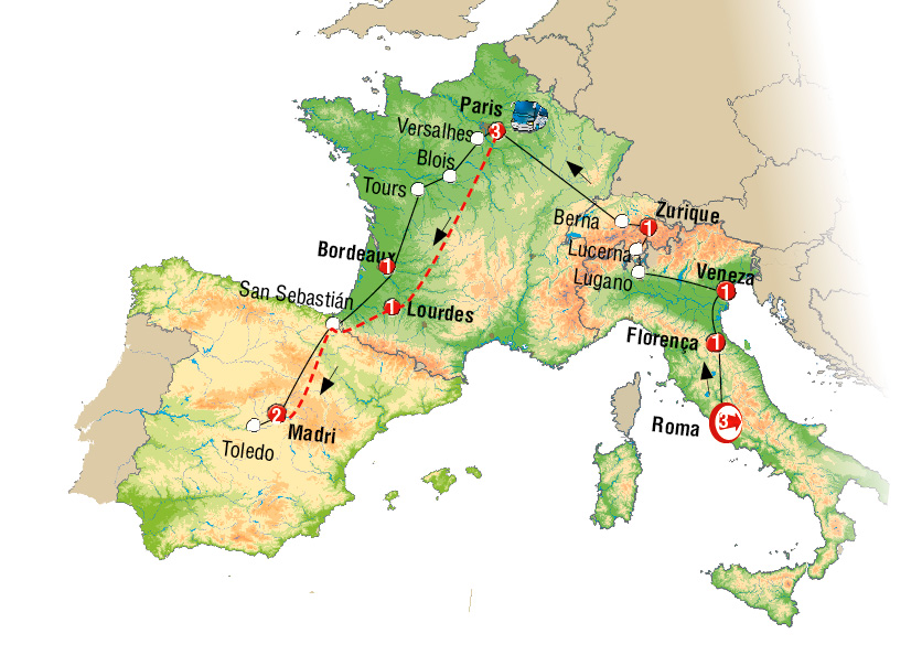 Serviços Gerais Europamundo: Circuito em ônibus guia falando espanhol e português, seguro básico de viagem (esse não atende ao tratado internacional de Schengen, necessário adquirir seguro viagem), hotel e café da manha tipo buffet.