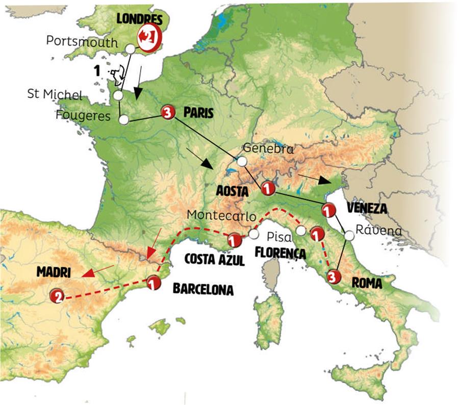 Londres, Oxford, barco porthsmouth saint malo, Mont Saint Michel, Fougeres, Chartres, Paris, Genebra, Aosta, Veneza, Ravena, Assis, Roma.