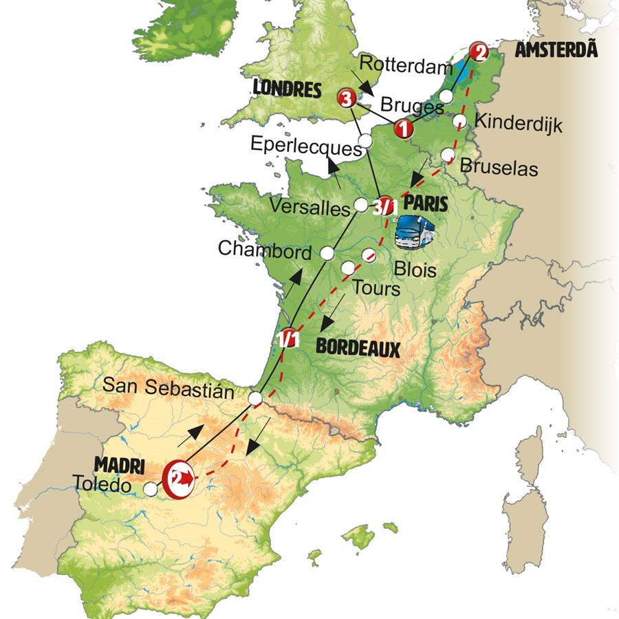 Madrid, San Sebastian, Bordeaux, Chambord, Paris, Canterbury, Londres, canal de la mancha, Bruges, Gante, Middelburg, Roterdã, Amsterdã.