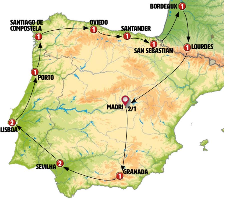 Madrid, Granada, Nerja, Málaga, Ronda, Sevilha, Merida, Évora, Lisboa, Fátima, Porto, Santuario do Bom Jesus, Cambados, Santiago de Compostela, Lugo, Cebreiro, León, Oviedo, Covadonga, Santilhana, Santander, Bilbao, guernica, San Sebastian, Bordeaux, Lourdes, Sallent de Gallego, Zaragoza.