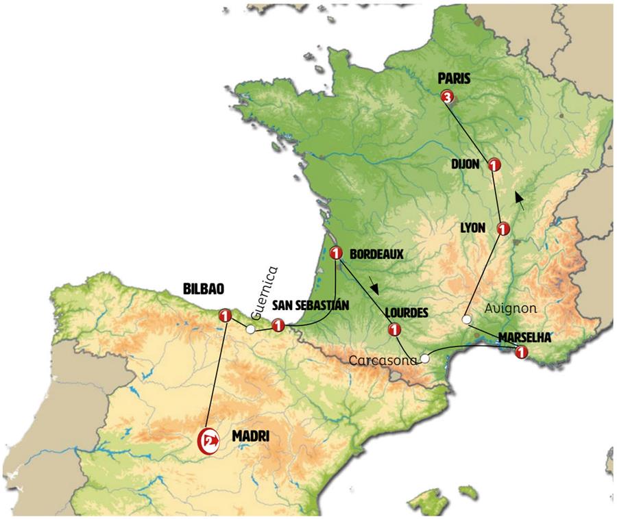Madrid, Segóvia, pedraza, Bilbao, guernica, San Sebastian, Bordeaux, Lourdes, Carcassonne, narbona, Marselha, Arles, Avignon, Lyon, Tournus, castillo de savigny, Beaune, Dijon, abadia de fontenay, semur en auxois, vezelay, Paris.