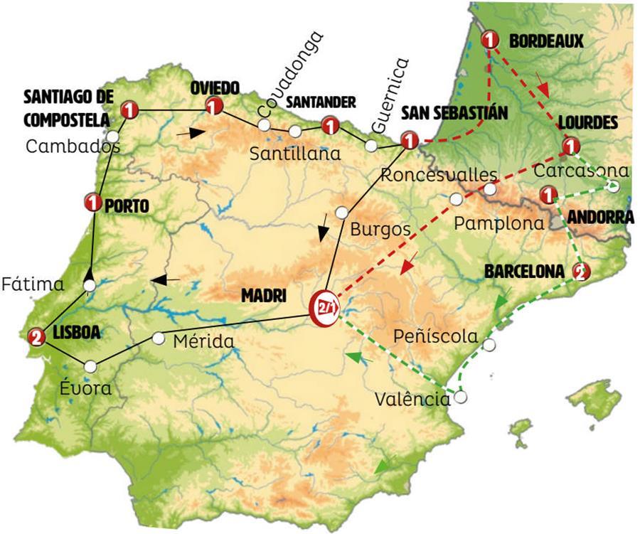 Madrid, Merida, Évora, Lisboa, Fátima, Porto, Santuario do Bom Jesus, Cambados, Santiago de Compostela, Lugo, Cebreiro, León, Oviedo, Covadonga, Santilhana, Santander, Bilbao, guernica, San Sebastian, Bordeaux, Lourdes, Sallent de Gallego, Zaragoza.