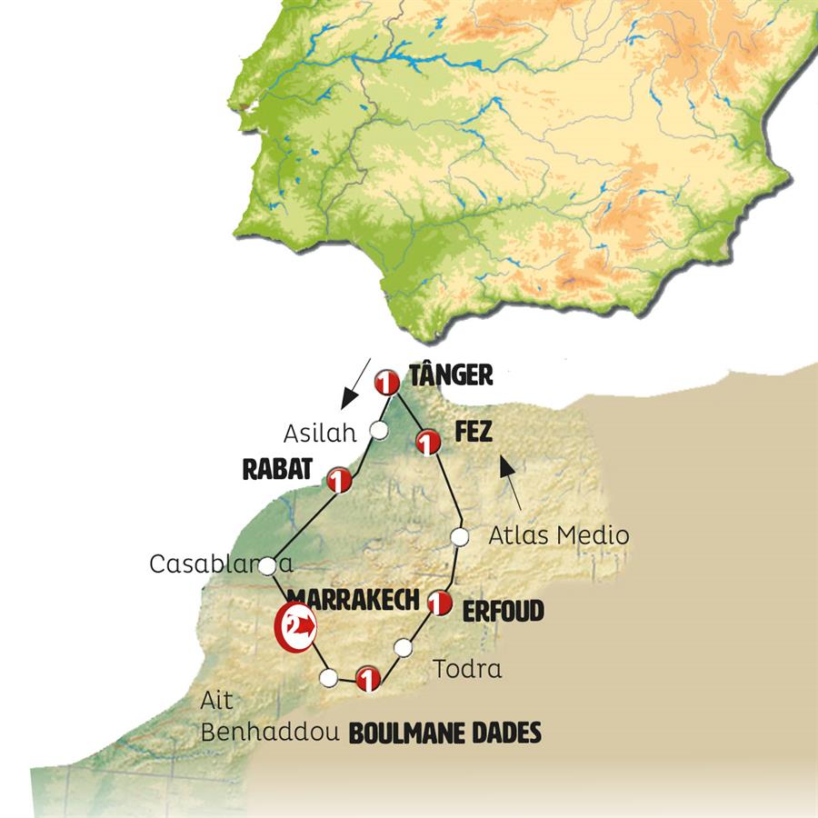 Marrakech, ait ben hadu, Ouarzazate, Boumalne Dadès, Todra, Erfoud, Fes, Tânger, assilah, Rabat, Casablanca.