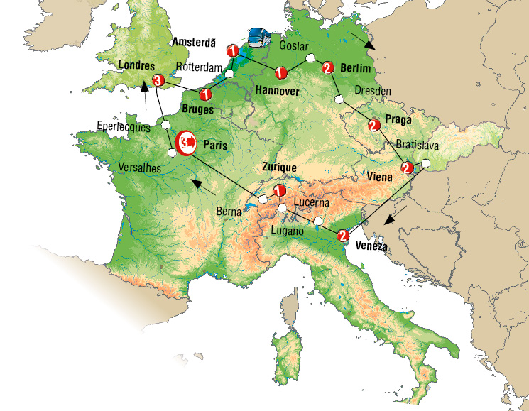 Paris, Canterbury, Londres, canal de la mancha, Bruges, Gante, Middelburg, Roterdã, Amsterdã, Hannover, Goslar, Berlim, Dresden, Praga, Ceske Budejovice, Cesky Krumlov, Viena, Maribor, Liubliana, Veneza, Lugano, Lucerna, Zurich, Strasbourg.