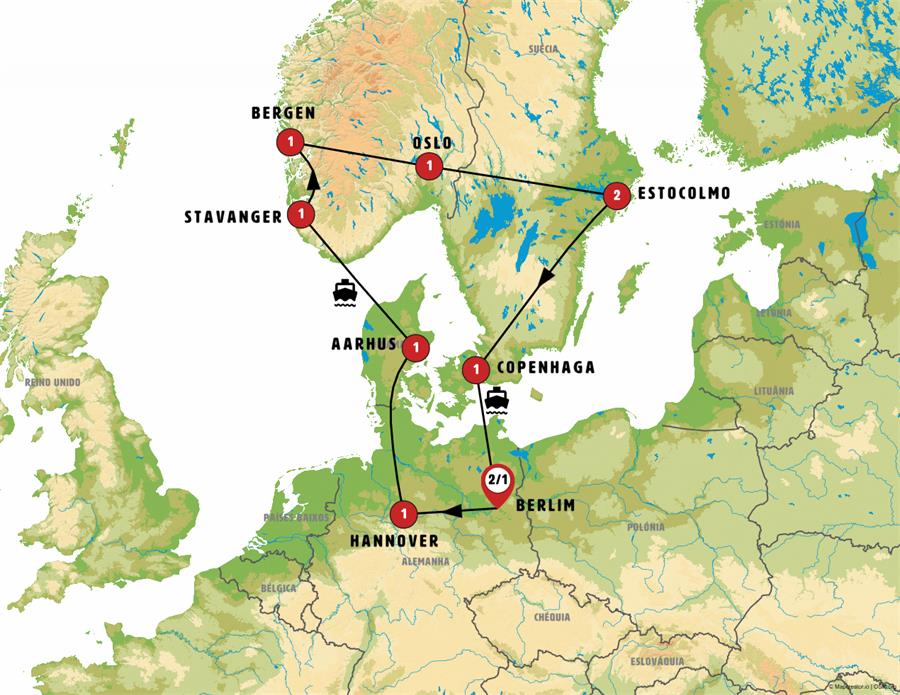 Berlim, wolfsburgo, Celle, Hannover, Hamburgo, Flensburg, Arhus, ferri kristiansand, Kristiansand, Stavanger, Bergen, fiordo sogne, Oslo, Orebro, Estocolmo, Helsingor, Copenhague.