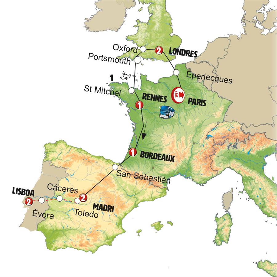 Paris, Canterbury, Londres, Oxford, barco porthsmouth saint malo, Mont Saint Michel, saint malo, Dinan, Rennes, Angers, Tours, Bordeaux, San Sebastian, Area de Serviço Foronda, Madrid, Merida, Évora, Lisboa.