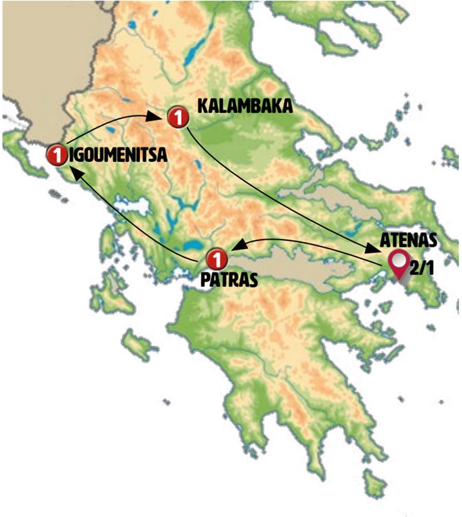 Atenas, Tripoli, Olympia, Patras, Igumenitsa, Corfu, Metsovo, Kalambaka, Delfos, Hosios Loukas.