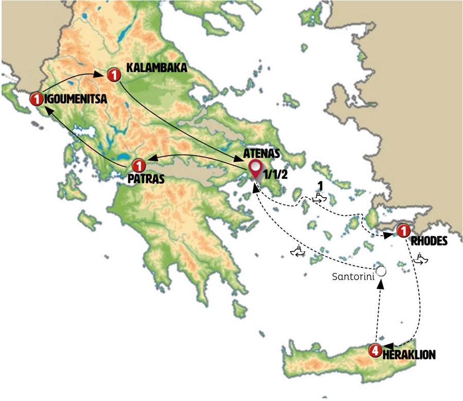 Atenas, Tripoli, Olympia, Patras, Igumenitsa, Corfu, Metsovo, Kalambaka, Delfos, Hosios Loukas, ferri atenas rodas, Rodes, Heraclion, Santorini.