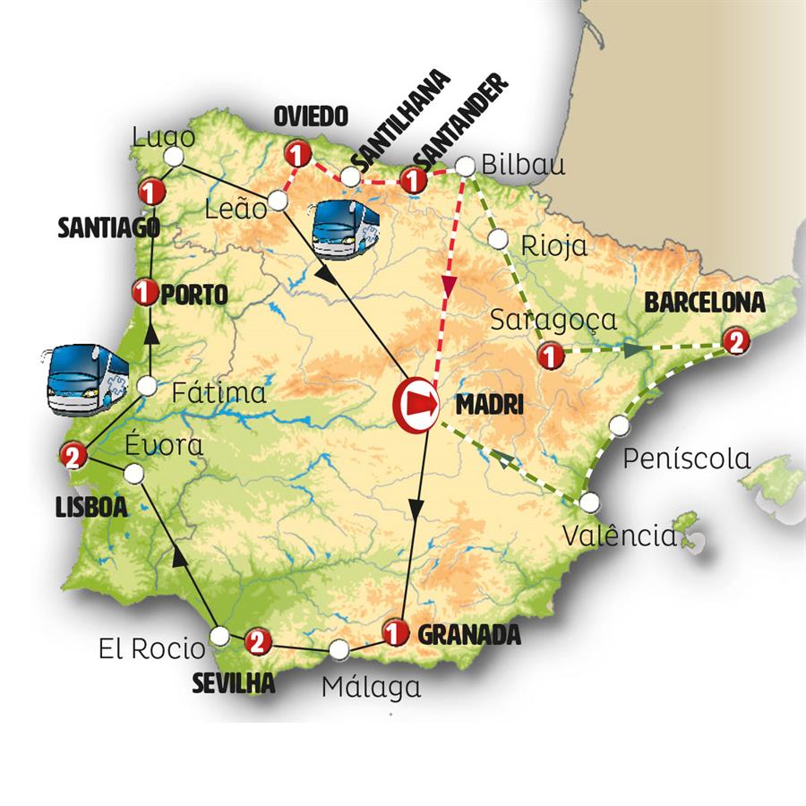 Madrid, Granada, Nerja, Málaga, Ronda, Sevilha, Merida, Évora, Lisboa, Fátima, Porto, Santuario do Bom Jesus, Cambados, Santiago de Compostela, Lugo, Cebreiro, León, Oviedo, Covadonga, Santilhana, Santander, Bilbao, Area de Serviço Foronda, La Rioja, Zaragoza, Poblet, Barcelona, peniscola, Valência.