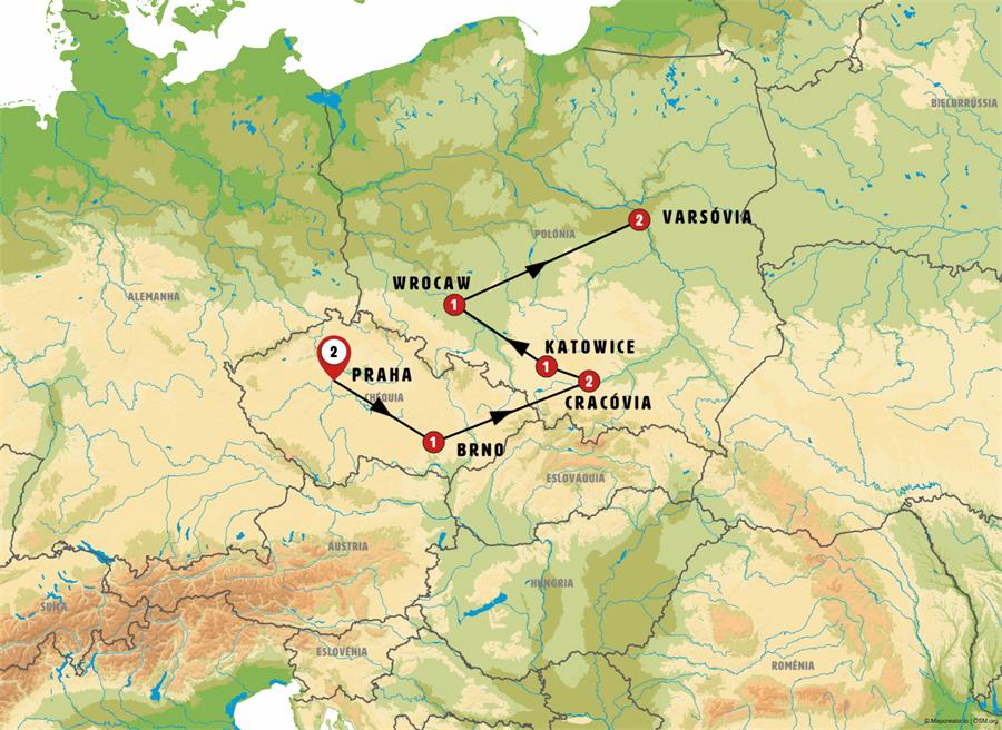 Praga, rBrno, Bratislava, Trencin, Cracóvia, Kalwaria Zebrzydowska, barwald dolny, Wadowice, Auschwitz, Katowice, Opole, Wroclaw, Poznan, Torun, Varsóvia.