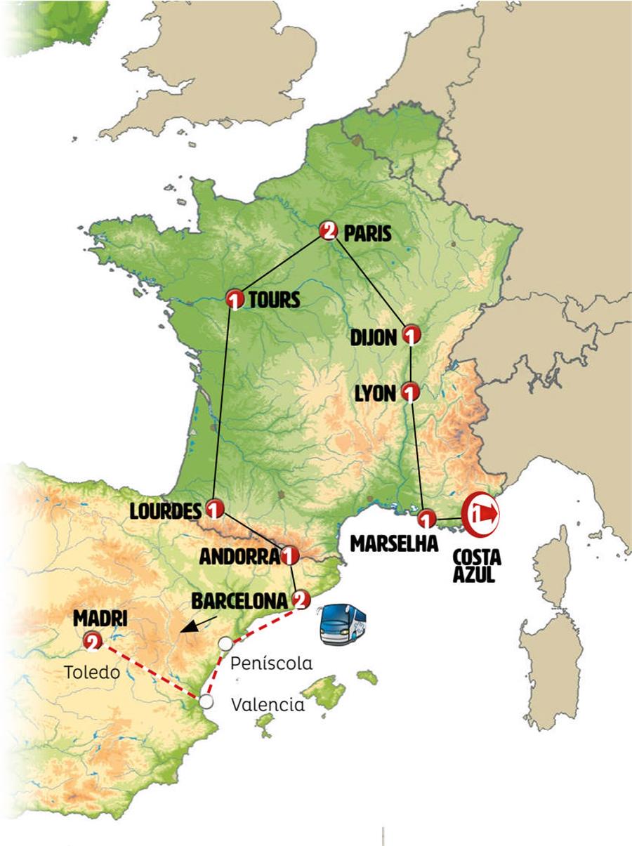 Cote D´azur, santa maxima, Saint Tropez, Marselha, Arles, Avignon, Lyon, Tournus, castillo de savigny, Beaune, Dijon, abadia de fontenay, semur en auxois, vezelay, Paris, Tours, Bordeaux, Lourdes, Carcassonne, Foix, Andorra, Montserrat, Barcelona, peniscola, Valência, Madrid.