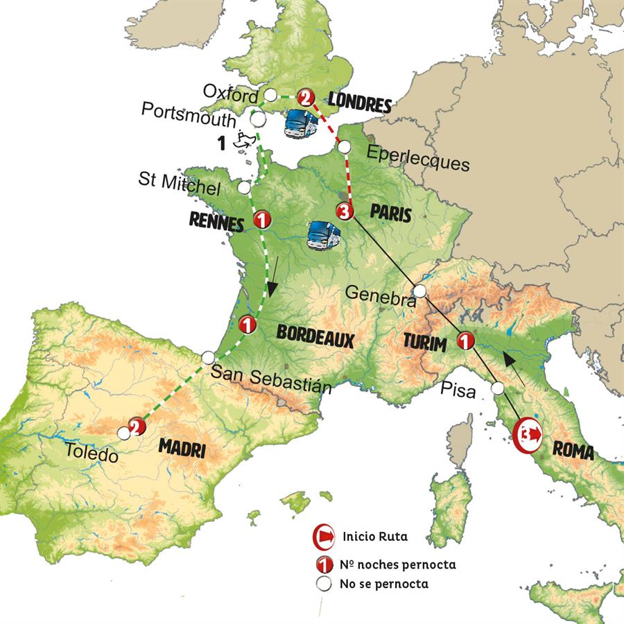 Serviços Gerais Europamundo: Circuito em ônibus guia falando espanhol e português, seguro básico de viagem (esse não atende ao tratado internacional de Schengen, necessário adquirir seguro viagem), hotel e café da manha tipo buffet.