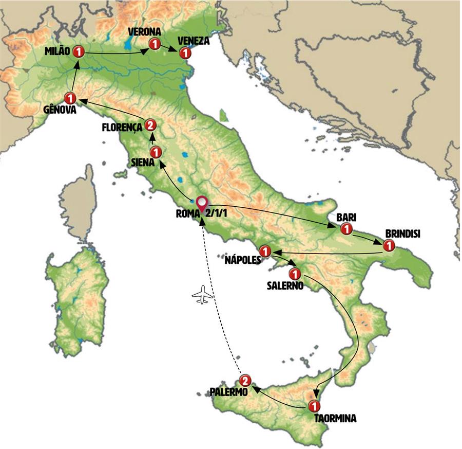 Roma, abadia san giovanni in venere, Termoli, Bari, Brindisi, Lecce, Gallipoli, Alberobello, Matera, Nápoles, Capri, Sorrento, Salerno, Paola, mesina , Taormina, Giardini Naxos , villa romana del casale, Palermo, Orvieto, Castiglione Del Lago, Siena, Monteriggioni, San Gimignano, Florença, Pisa, Cinque Terre, Gênova, Portofino, Milão, Região dos Lagos, Verona, Veneza.