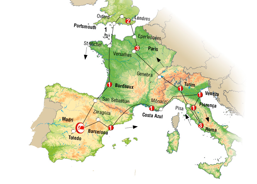 Madrid, Zaragoza, Poblet, Barcelona, Cote D´azur, Cidade de Mônaco, Gênova, Veneza, Florença, Roma, Pisa, Torino , Genebra, Paris, Canterbury, Londres, Oxford, barco porthsmouth saint malo, Mont Saint Michel, saint malo, Dinan, Rennes, Angers, Tours, Bordeaux, San Sebastian, Area de Serviço Foronda.