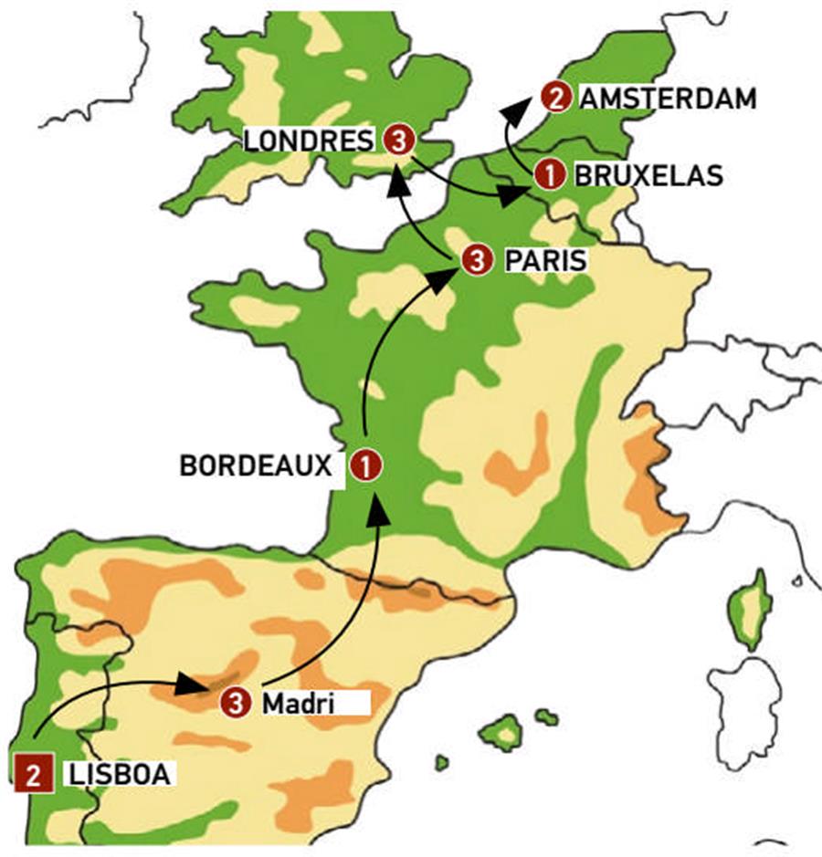 Lisboa, Cáceres, Madrid, San Sebastian, Bordeaux, Blois, Paris, Canterbury, Londres, Calais, Bruges, Gante, Haia, Amsterdã.