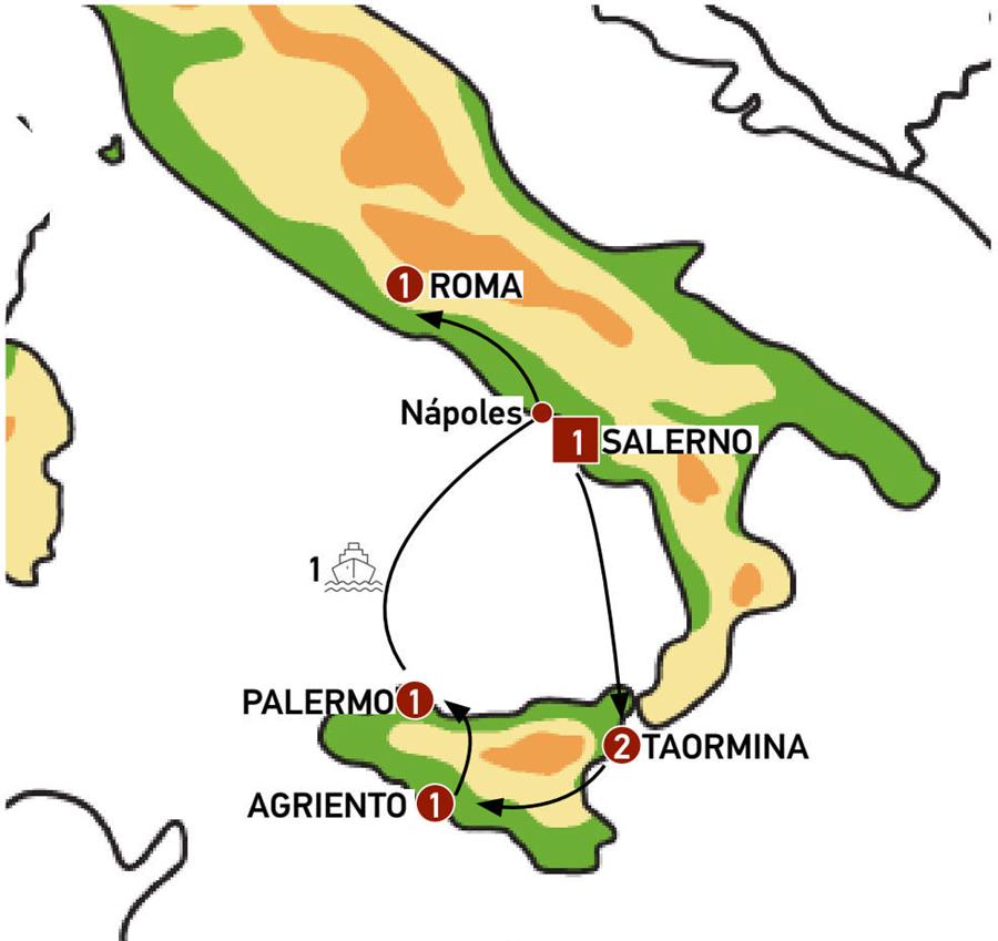 Roma, Nápoles, Capri, Sorrento, Salerno, Paola, mesina , Taormina, Catania, Siracusa, Agrigento, Marsala, Érice, Palermo, Monreale, ferri palermo napoles, Pompeia.