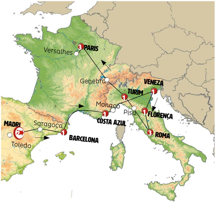Madrid, Zaragoza, Barcelona, Cote D´azur, Cidade de Mônaco, Gênova, Veneza, Florença, Roma, Pisa, Torino , Genebra, Paris.