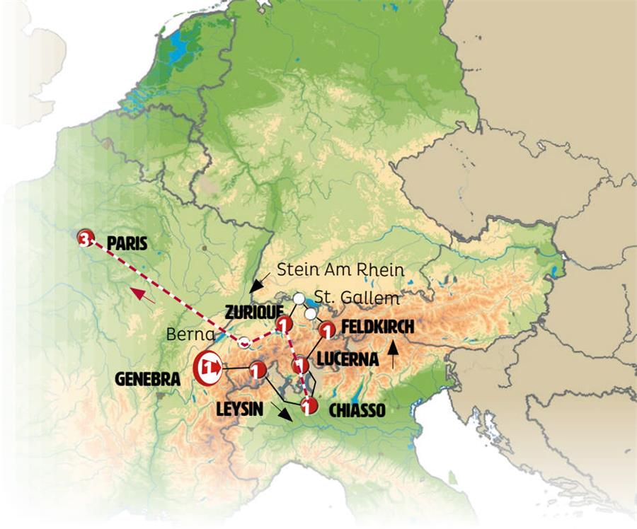 Genebra, lausana, Gruyeres, friburgo, Interlaken, aareschlucht, Lugano, chiasso, Bellinzona, Altdorf, Lucerna, Einsiedeln, Vaduz, Feldkirch, saint gallen, Constança, Stein Am Rhein S, cataratas del rin, Zurich.
