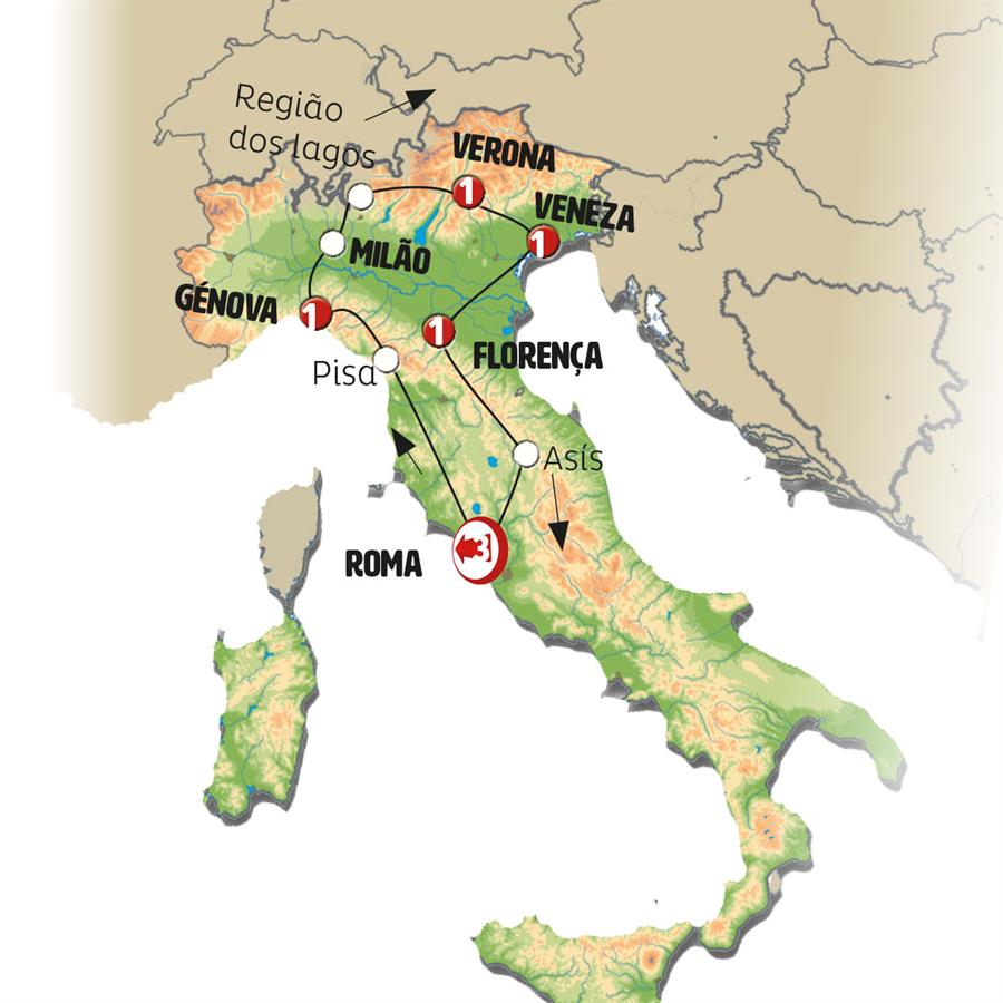 Roma, Pisa, Santa Margherita Ligure, Portofino, Gênova, san giulio, Milão, Verona, Veneza, Florença, Siena, Assis.
