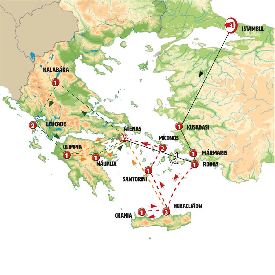 Istambul, Éfeso, Kusadasi, Bodrum, Marmaris, Rodes, Heraclion, Santorini, miconos, Atenas.