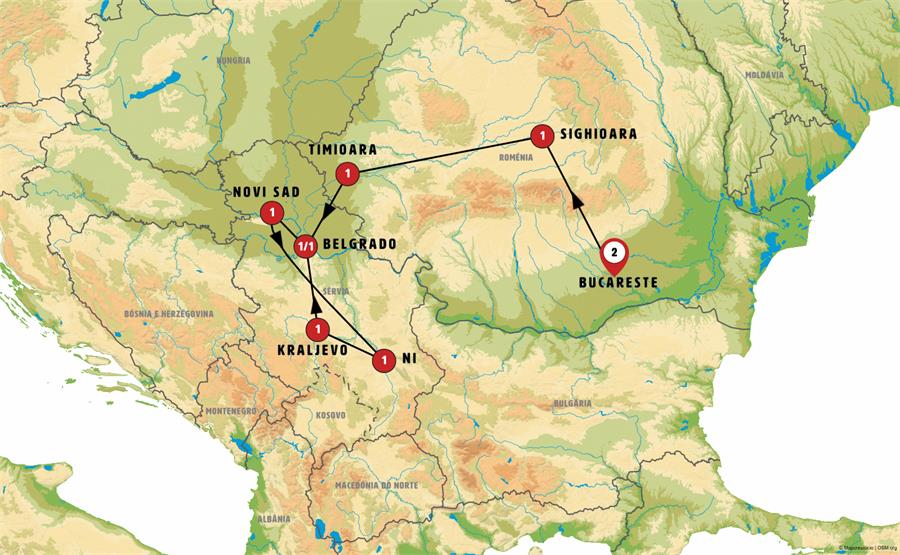 Bucareste, Sinaia, Bran, Sighisoara, Biertan, Sibiu, Hunedoara, Timisoara, Belgrado, fruska gora, sremski karlovci, Novi Sad, viminacium, manasija, Nis, zica, studenica, kraljevo, ravanica, oplenac.