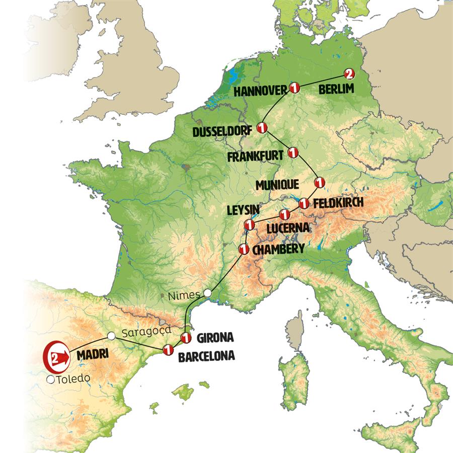 Madrid, Zaragoza, Poblet, Barcelona, Gerona, carrieres de lumiere, Chambery, Genebra, Gruyeres, Leysin, Interlaken, Lucerna, Einsiedeln, Vaduz, Feldkirch, Lago Constança , Lindau, Munique, Füssen, Rotemburgo, Frankfurt, crucero por el rhin, Colônia, Dortmund, ruta cuentos de hadas, Hannover, Goslar, Berlim.