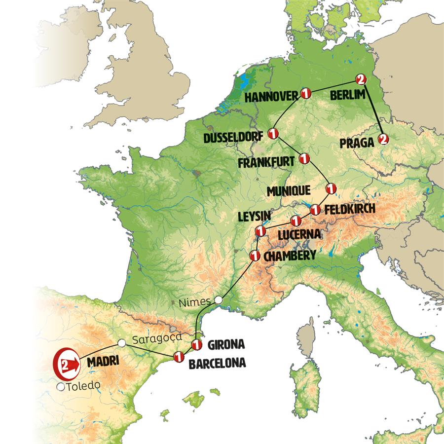 Madrid, Zaragoza, Poblet, Barcelona, Gerona, carrieres de lumiere, Chambery, Genebra, Gruyeres, Leysin, Interlaken, Lucerna, Einsiedeln, Vaduz, Feldkirch, Lago Constança , Lindau, Munique, Füssen, Rotemburgo, Frankfurt, crucero por el rhin, Colônia, Dortmund, ruta cuentos de hadas, Hannover, Goslar, Berlim, Dresden, Praga.