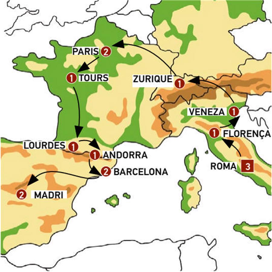 Roma, Florença, Veneza, Lugano, Lucerna, Zurich, Strasbourg, Paris, Tours, Bordeaux, Lourdes, Carcassonne, Foix, Andorra, Montserrat, Barcelona, peniscola, Valência, Madrid.
