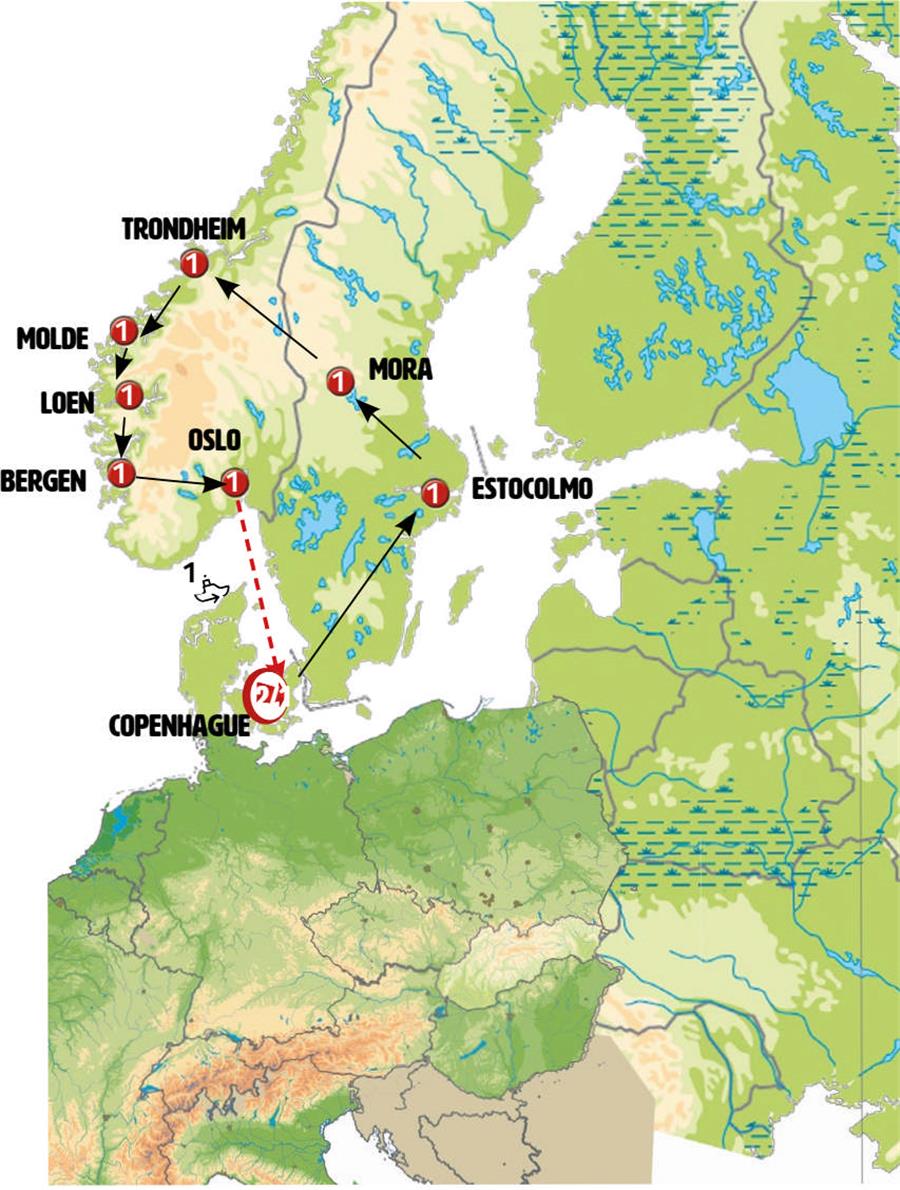 Copenhague, jonkoping, vadstena, Estocolmo, Mora, funasdalen, Roros, Trondheim, KRISTIANSUND, carretera atlantica, MOLDE, Geiranger, briksdal, Loen, Bergen, Eidfjord, voringfossen, Geilo, Oslo, ferri oslo copenhague.