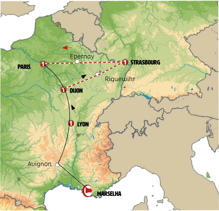 Marselha, Arles, Avignon, Lyon, Tournus, castillo de savigny, Beaune, Dijon, besanzon, Colmar, Riquewihr, Strasbourg, champagne, Paris.