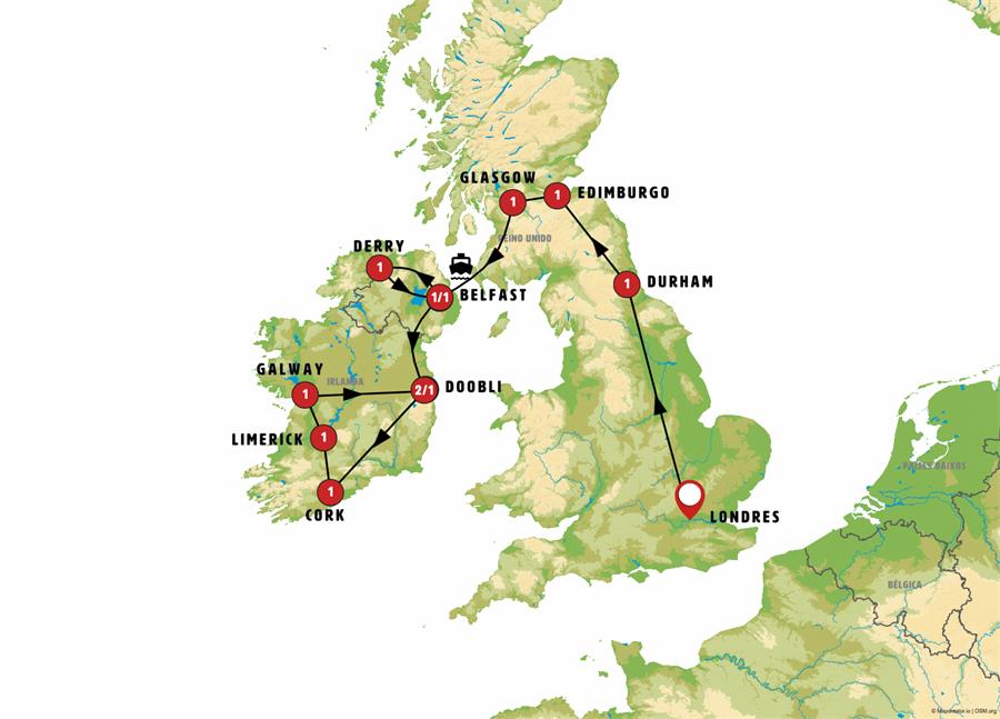 Londres, Cambridge, York, Durham, Alnwick, Edimburgo, Inverness, Lago Ness, Fort Augustus, Glasgow, belfast, cushendun, ballycastle, calzada del gigante, derry, Donegal, marble arch, castillo de hillsborough, Dublin, Powerscourt, Kilkenny, Cashel, Cork, Kinsale, Killarney, Limerick, Acantilados de Moher, Galway, Clonmacnoise.