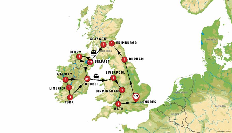 Londres, Cambridge, York, Durham, Alnwick, Edimburgo, Inverness, Lago Ness, Fort Augustus, Glasgow, belfast, cushendun, ballycastle, calzada del gigante, derry, Donegal, marble arch, castillo de hillsborough, Dublin, Powerscourt, Kilkenny, Cashel, Cork, Kinsale, Killarney, Limerick, Acantilados de Moher, Galway, Clonmacnoise, Caernarfon, Liverpool, Chester, lichfield, Birmingham, stratford, stow on the wold, gloucester, Bath, stonehenge, Salisbury.