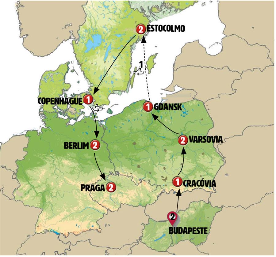 Budapeste, Bratislava, Trencin, Cracóvia, Auschwitz, Czestochowa, Varsóvia, olsztynek, canal elblag, malbork, Gdansk, Sopot, ferry sopot karlskrona, Vastervik, Estocolmo, Helsingor, Copenhague, Berlim, Dresden, Praga.