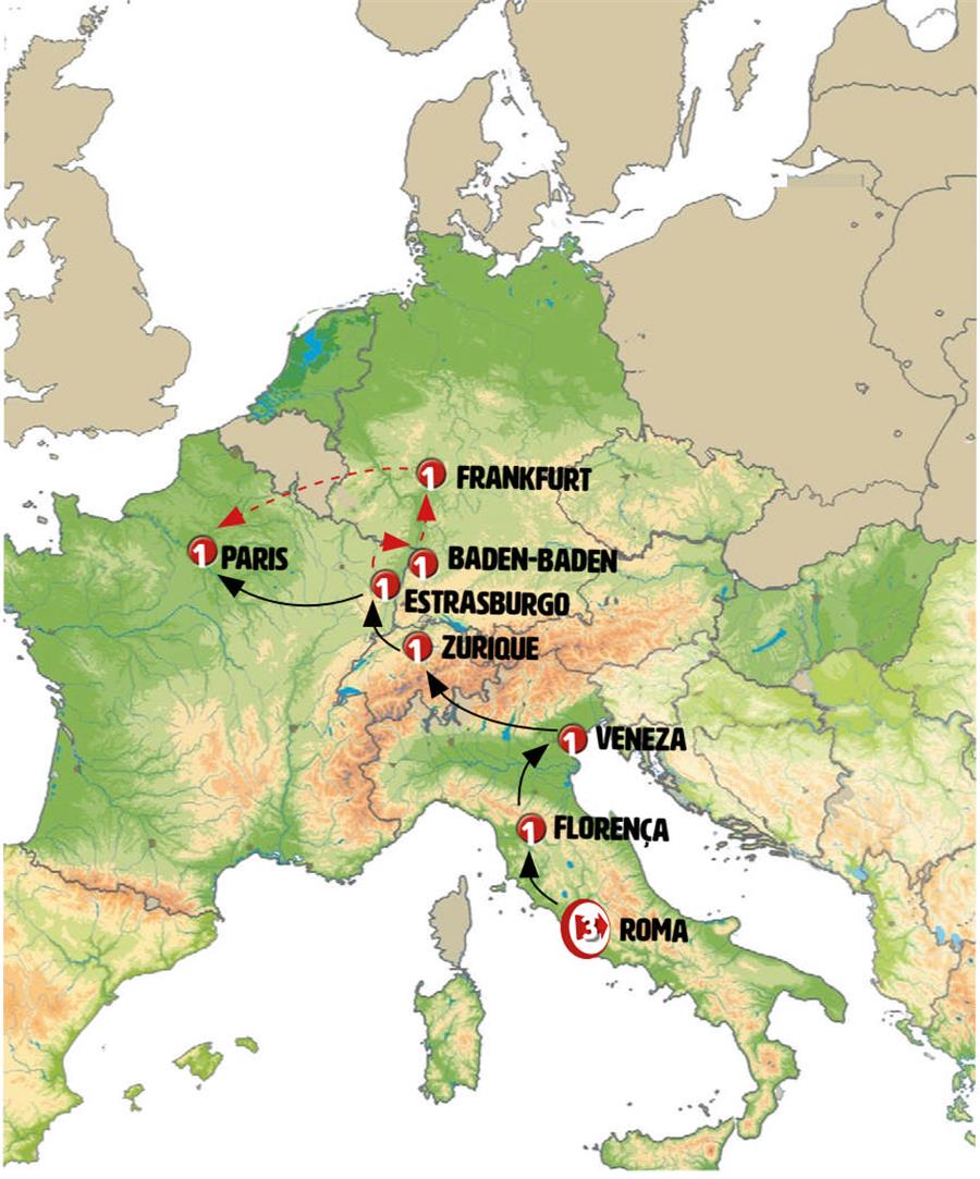 Roma, Florença, Veneza, Lugano, Lucerna, Zurich, basilea, Colmar, Riquewihr, Strasbourg, champagne, Paris.