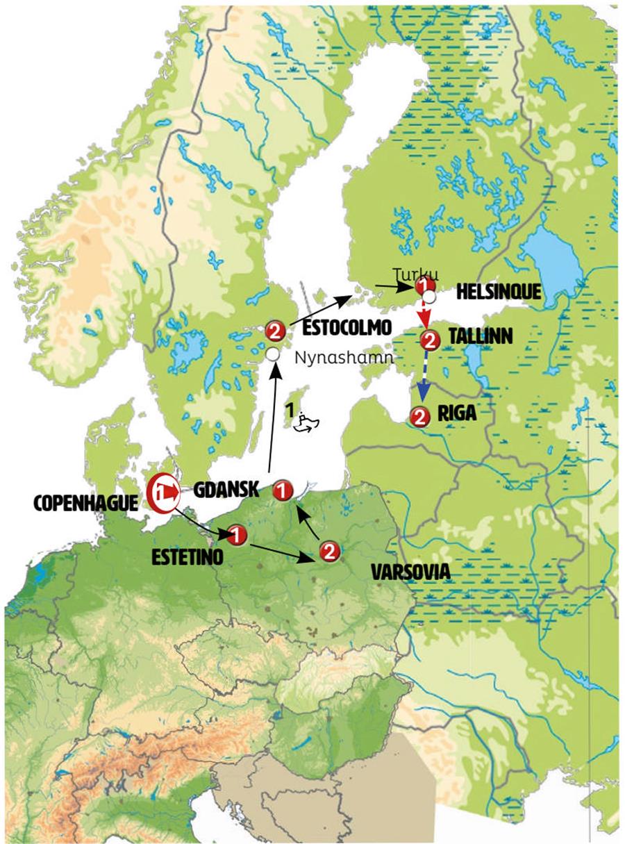 Copenhague, Rostock, Szczecin, Bydgoszcz, Torun, Varsóvia, olsztynek, canal elblag, malbork, Gdansk, Sopot, ferry sopot karlskrona, Vastervik, Estocolmo, ferri estocolmo turku, Naantali, Helsinki.