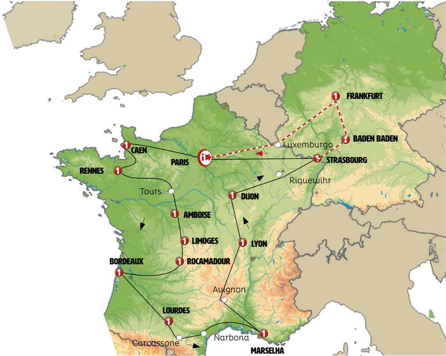 Paris, Rouen, Arromanches, Caen, Mont Saint Michel, saint malo, Dinan, Rennes, Angers, Tours, Villandry, Amboise, Chenonceaux, Chambord, Limoges, Sarlat, beynac et cazenac, Rocamadour, Caverna de Padirac, collonges la rouge, Saint Emilion, Bordeaux, Lourdes, Carcassonne, narbona, Marselha, Arles, Avignon, Lyon, Tournus, castillo de savigny, Beaune, Dijon, besanzon, Colmar, Riquewihr, Strasbourg, champagne.